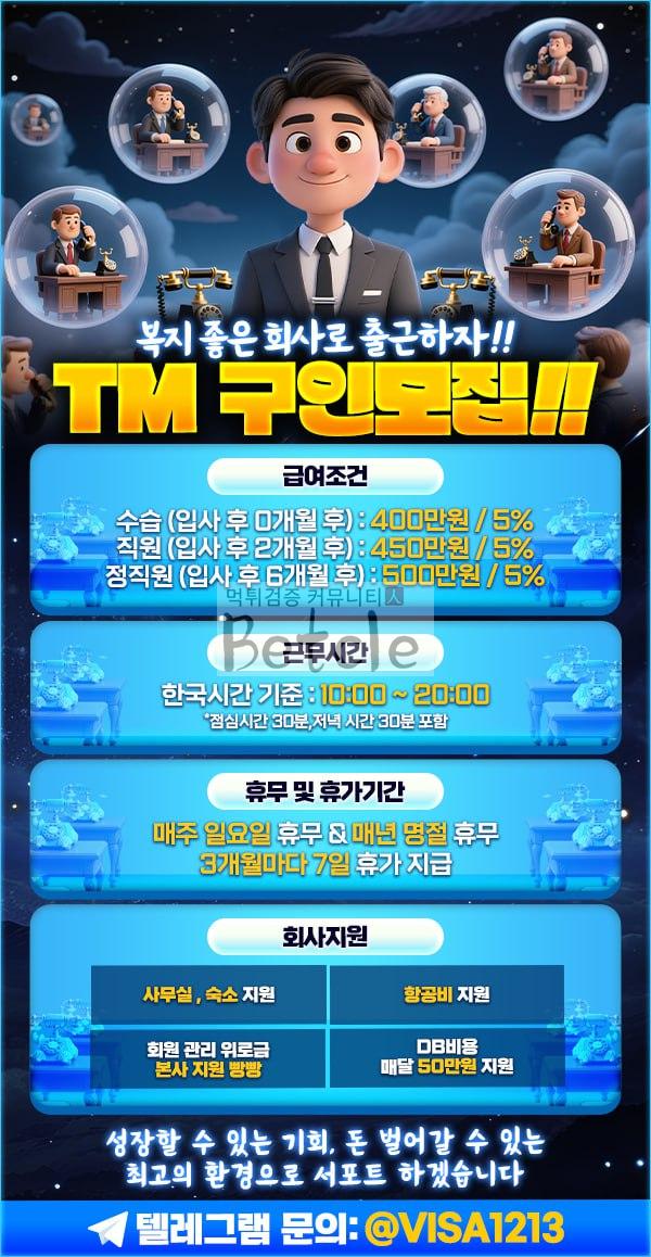 ((해외)) TM 구인모집!! 페이지 정보 작성자돈벌어보자 댓글0건 조회37회 작성일26.01.06 21:04 본문 공유 * 급여 조건* 수습 (입사 후 0개월 후) : 400만원 / 5% 직원 (입사 후 2개월 후) : 450만원 / 5% 정직원 (입사 후 6개월 후) : 500만원 / 5% * 특별보너스 * 루징금액 3천만원 달성 시 50만원 지급 루징금액 5천만원 달성 시 150만원 지급 루징금액 1억원 달성 시 350만원 지급 *근무시간* 한국시간 기준 : 10:00 ~ 20:00 *점심시간 30분,저녁 시간 30분 포함 *휴무 및 휴가기간* 매주 일요일 휴무 매년 명절 휴무 3개월마다 7일 국내,국외 휴가 지급 *회사지원* 사무실 , 숙소 지원 DB비용 매달 50만원 지원 회원 관리 위로금 본사 지원 빵빵 업무 용품 전체 지원 항공비 지원 성장할 수 있는 기회 , 돈 벌어갈 수 있는 최고의 환경으로 서포트 하겠습니다 담당자 문의 = @visa1213 다음글에쎈씨후기 26.01.06 댓글 0 댓글목록 등록된 댓글이 없습니다.